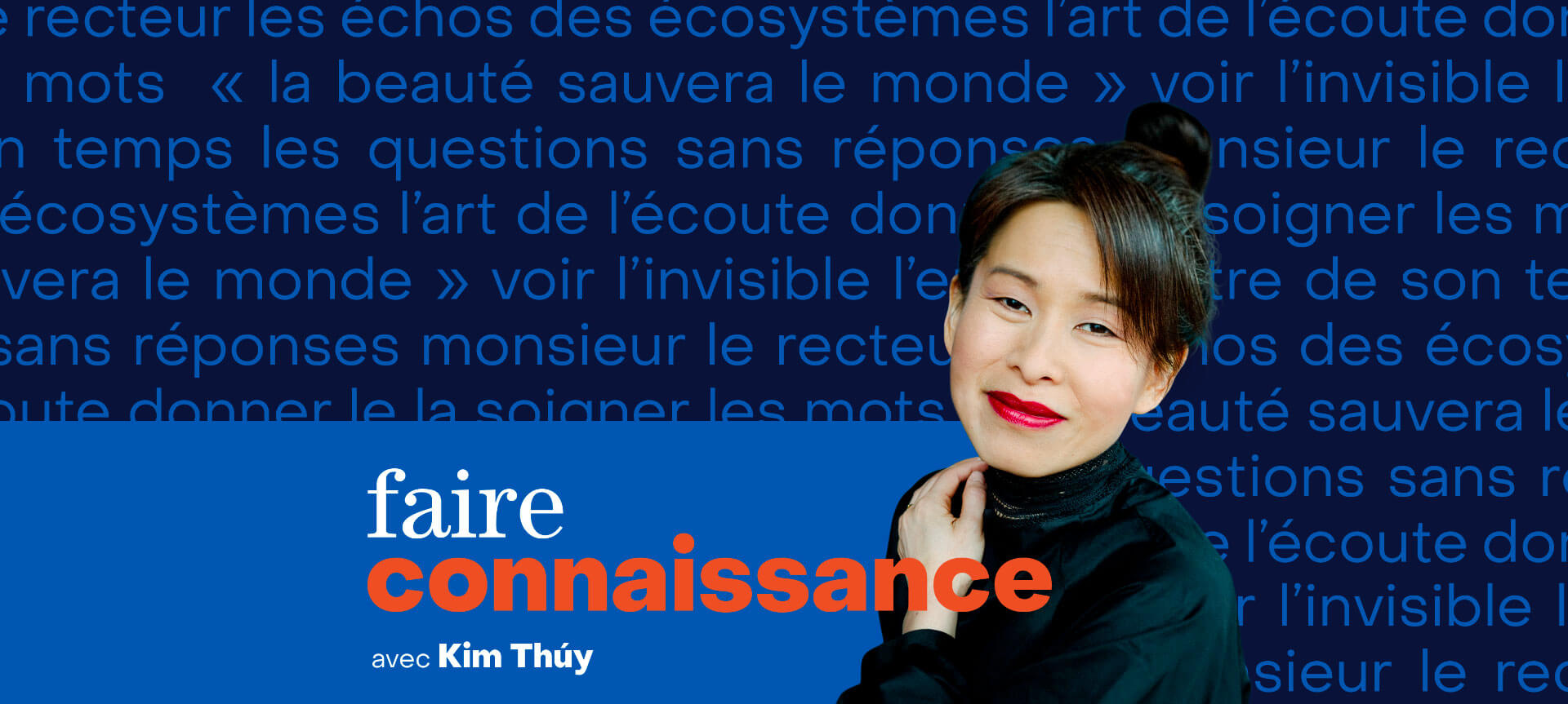 Chaque année, nous invitons des personnalités de la société civile à participer à la vie intellectuelle, culturelle et sociale de nos campus. Nous comptons sur leurs perspectives originales pour repenser le rôle de l’Université de Montréal dans le Québec et le monde d’aujourd’hui. En 2022, Kim Thúy a fait partie de la première cohorte des Sages, aux côtés de Nathalie Bondil et Joséphine Bacon. Le balado Faire connaissance est sa contribution.